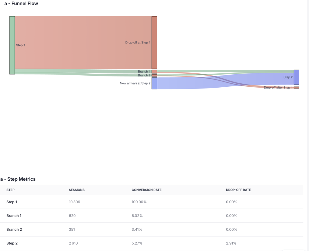 Each step in a funnel displays two critical data points: the drop-off rate (how many users left the journey at that point) and the arrival rate (how many users entered the funnel from a previous step). This dual view lets you pinpoint friction points with precision and understand whether a drop-off is a design issue, a content problem, or simply natural behavior.